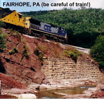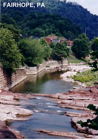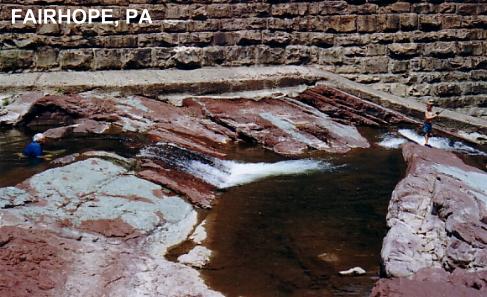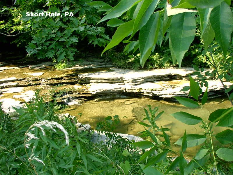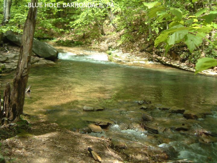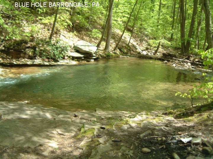 DIRECTIONS | From Pittsburgh, take I-70/76 (PA TPKE) east to the Somerset exit. From the Somerset exit, take RT 31 (W. Main St.) a short way west then RT 281 (New Centerville Rd.) southwest (through New Centerville and New Lexington) about 10.5 miles to Barronvale (the road is now called Scullton Rd.). In Barronvale, take Ream Rd. north 1 mile then jog right on Covered Bridge Rd. then quickly left on Fall Run Rd. (Here is a picture of the covered bridge . Go about 1 mile on Fall Run Rd. then turn right on Blue Hole Rd. (a definite clue) (gravel). Go about 1.3 miles on Blue Hole Rd. and ... guess what... a beautiful blue hole on the right. |