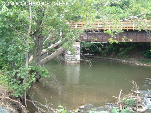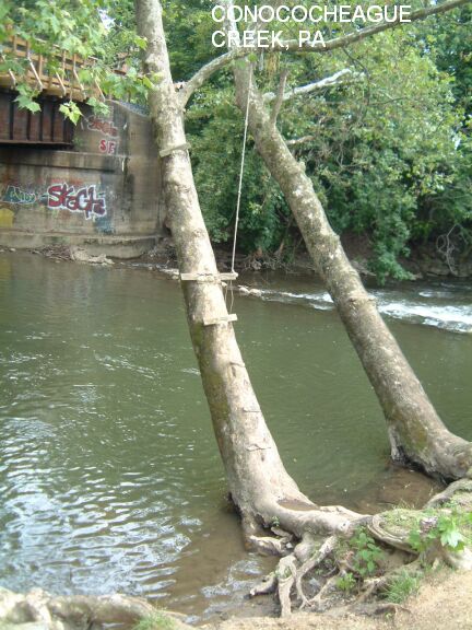 DIRECTIONS | From Hagerstown, MD go north on I-81 to Chambersburg, PA. The Conococheague Creek goes right through Chambersburg and has many swimming and tubing places. One place: In downtown Chambersburg, going west on RT 30, after you cross RT 11 and go over small bridge, see the Texas Lunch Family Restaurant and a parking lot on your left (south side). (There may also be a sign for the restaurant and another parking lot across the street, to your right, on the north side. You want to walk though the parking lot on the left or south side of the street.) Park here and walk through the restaurant parking lot. There is an old piece of railroad trestle (now a pedestrian bridge) that spans the creek and a path next to it that leads right to a swimming hole (go around behind the chain link fence) with a rope swing.