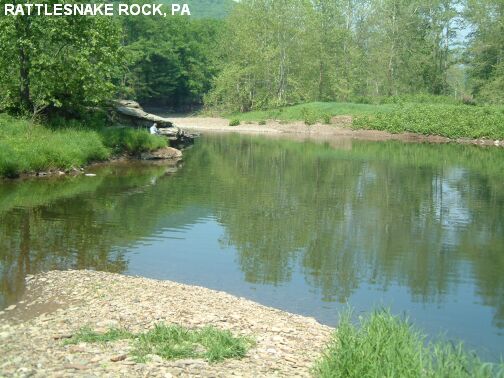 RATTLESNAKE ROCK [RATT]: Swimming hole in Pine Creek below large rock. Busy place, boat launch spot, fishing place, access to West Rim Pine Creek Canyon Trail, huge parking, toilets. PHOTO . To get here from Wellsboro, go south on RT 287 (past turn off to Stony Fork above) to Morris then take RT 414 west (right turn) to Blackwell (south end of Pine Creek Canyon). Continue through Blackwell on RT 414 a short distance where you can't miss seeing on the south side of road (left side) a very large parking area and a sign "Rattlesnake Rock". Park and take the foot path (not the boat launch road) across the West Rim Trail and down to Pine Creek. You will be at Rattlesnake Rock and the swimming place is here. May be jumping. Bathing suits customary, very busy place. LAT,LON lat=41.5405,lon= -77.406 (source: measured) (accuracy: exact) LINK TO GOOGLE MAP. Very confident. Verified 6/07/05. Updated 6/09/05. |