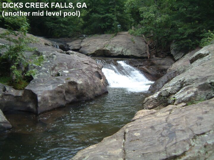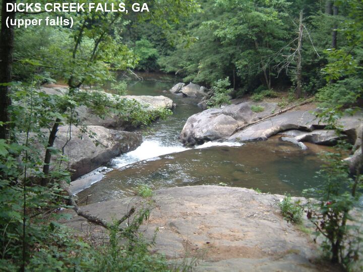 DICKS CREEK [DICK]: A popular, beautiful multi-tiered waterfall with many swimming holes. PHOTO , PHOTO , PHOTO , PHOTO , PHOTO , YOUTUBE , YOUTUBE . No facilities. To get here from Porter Springs (above) CONTINUE on RT 19. About .5 miles before you get to Turner's Corner (intersection of RT 19 with RT 129/11) turn left at a sign that says "Chestattee WMA" (Dick's Creek Rd). Follow this road about 2.8 miles to a large parking area with signs. The waterfalls and swimming holes are on the left. LAT, LON : lat=34.67950, lon= -83.93702(source: measured) (accuracy: approximate) LINK TO GOOGLE Verified 7/07. Very confident. Updated 7/18/07.