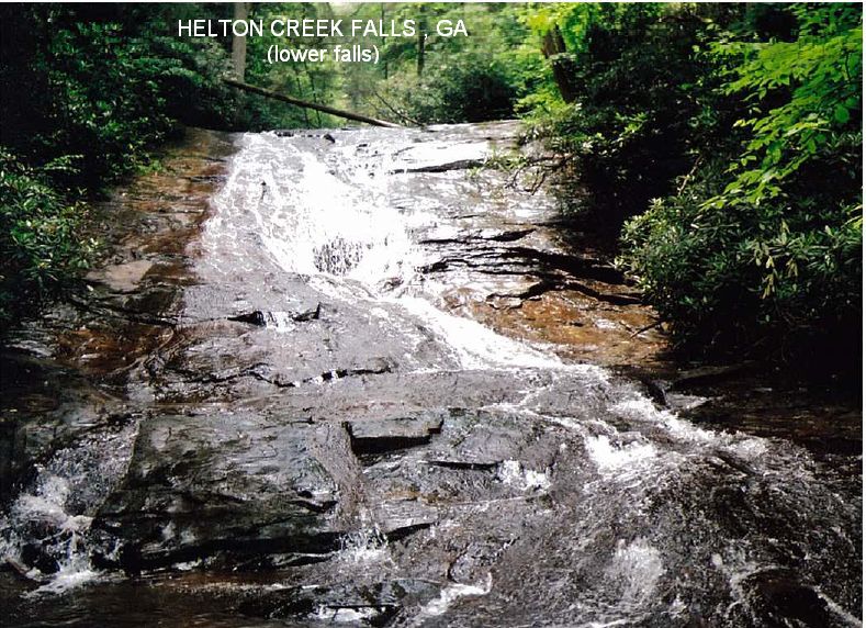 HELTON CREEK FALLS [HELT]: Here are two falls with a well-maintained path and an observation platform for the upper falls. At the bottom of the upper falls there is a deep pool but swimming is prohibited there. The lower falls has shallow pools, not deep enough to swim but good for playing in the water and cooling off. PHOTO . PHOTO . To get here from Dicks Creek Falls (above) continue north on RT 19 all the way to the vicinity of Vogel S. P.. About 1.5 miles BEFORE you get to Vogel S. P. on RT 19 (south of Vogel Park), turn east (right)at a sign that says "Helton Creek Falls" (FS 118). (It is signed "Helton Creek Falls" on the southern approach, but not the northern.) The road is paved at first while going through the Vogel Community. The road changes to gravel, and, at 2.2 miles from RT 19, there is a nice parking area for Helton Creek Falls. Camp at Vogel S. P. nearby. LAT, LON : lat=34.75257, lon= -83.89568 (source: measured) (accuracy: exact). LINK TO GOOGLE . Verified 7/07. Very confident. Updated 6/2011.