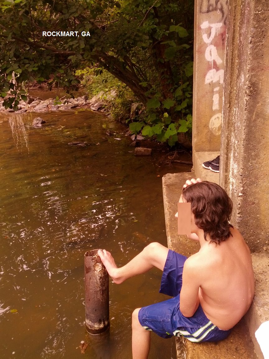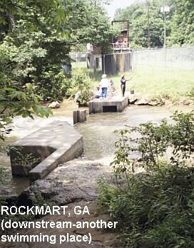 DIRECTIONS | From Atlanta, take RT 278 northwest to town of Rockmart. In Rockmart, go south on Marble Street (one of the main streets) On the other side of "Historic Downtown Rockmart", Marble St. crosses the train tracks and then passes the entrance to the Silver Comet Trail and then over Thompson's Creek. Park near here (not exactly sure where to park) and walk upstream on the trail a short distance to where you will see a well-worn path angling down toward the creek. The main swimming hole is at the bottom of this short path. If you walk downstream on the path, there is a small dam and apparently kids swim here also depending on water level. |
