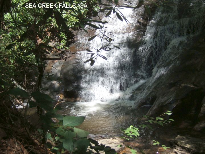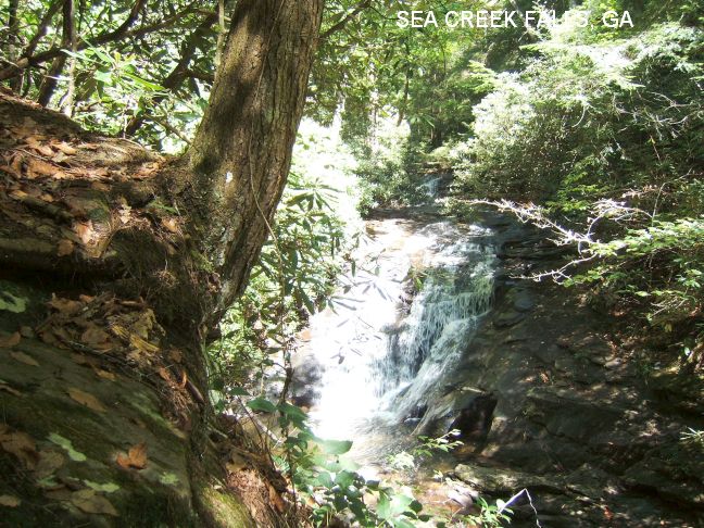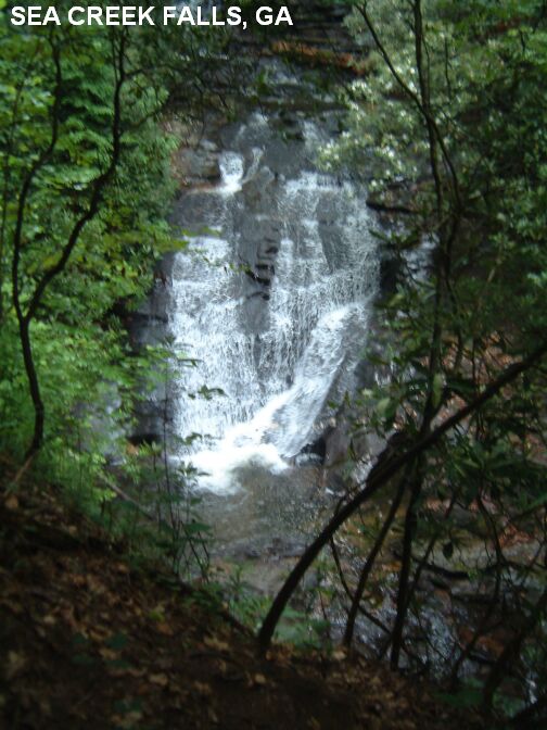 SEA CREEK FALLS [SEAC]: A waterfall you can stand under for a shower with a small plunge pool at the bottom - not really big enough for swimming but a very scenic area. PHOTO , PHOTO , PHOTO . To get here from Porter Springs (above), where RT 60 departs from RT 19 TAKE RT 60 north (left turn)toward Suches. Before the town of Cooper Creek, turn northeast (right) onto FS 6 (toward Cooper Creek Rec Area) and go about 4 miles to a sign on the left for Sea Creek Falls. Park and walk a short way to the falls. Another 2 miles or so on FS 6 brings you first to Mauch Campground then to Cooper Creek campground (a nicer place to camp). LAT, LON : lat=34.77381, lon= -84.09702 (source: measured) (accuracy: approximate) LINK TO GOOGLE Verified 7/07. Very confident. Updated 7/18/07