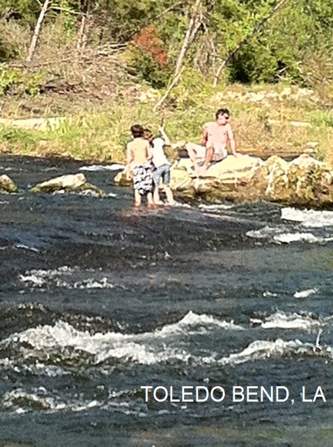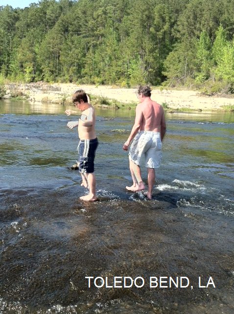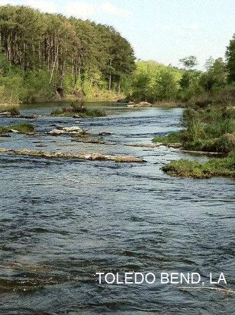 DIRECTIONS | From Alexandria (on I-49), take RT 28 west about 50 miles to Leesville then turn right onto RT 171 north (Shreveport Hwy) and go about 8 miles to Anacoco. In Anacoco, take RT 111 west (Trigger Trapp Rd) about 10 miles then continue straight onto RT 392 (dont follow RT 111 where it turns south) and go about 5 miles, through South Toledo Bend State Park, and turn left (south) on RT 191 and go about 2 miles. Just after you cross the first spillway bridge, immediately turn left on the first gravel road on the left. This road will loop around and will parallel the Sabine River where there are sandstone boulders, small rapids and rock ledges. Park as indicated and hike several hundred feet back up the river bank to find clear, swift water and several deep swimming holes. |