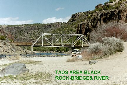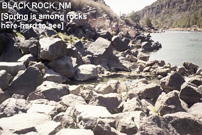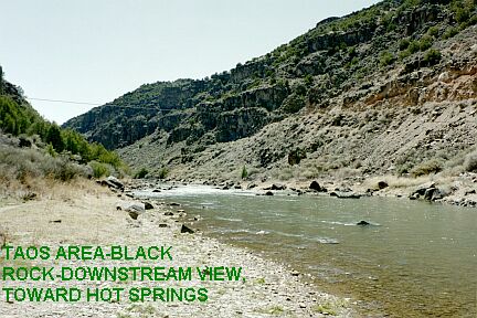 BLACK ROCK HOT SPRINGS[BLAC]: Hot springs with rugged rocks all around but nice sand bottom and 97 degree water. Some algae in the spring, but no sulphurous smell and clear water. Right by the banks of the Rio Grande at the bottom of a spectacular canyon. Scenic beauty worth the drive down here even if you don't take a dip. PHOTO , PHOTO , PHOTO . May be flooded at high water; otherwise can cool off in the river. There is a sandy beach on the river on the east side of the bridge (before you cross.) LAT, LON :lat=36.5283, lon= -105.7126(source: Soak.net files) (accuracy:exact) LINK TO GOOGLE MAP.