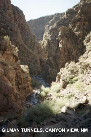 GILMAN TUNNELS[GILM]: The Gilman Tunnels are 2 roadway tunnels in spectacular solid rock cliffs towering above the Guadalupe River. Well worth seeing just to see the canyon and river, there appear to be several swimming places here also. PHOTO , PHOTO . To get here: continue west (really south) on RT 4 beyond Jemez Springs and the Linda Vista Campground and turn west (right) on RT 485. Follow this road along the Guadalupe River through the 2 Gilman Tunnels. Right after you clear the second tunnel, pull off in the parking area on the right. It appears that you easily can climb down here to the river and there is a deep pool for swimming. Also, if you continue on this road to the gate (where it becomes unpaved) just past the gate on the right is a very accessible rock ledge over the water with an apparent swimming place. LAT, LON :lat=35.71978, lon= -106.75886(source: DeLorme) (accuracy:general area) LINK TO GOOGLE MAP Very confident. Verified 9/02. Updated 12/17/2007.