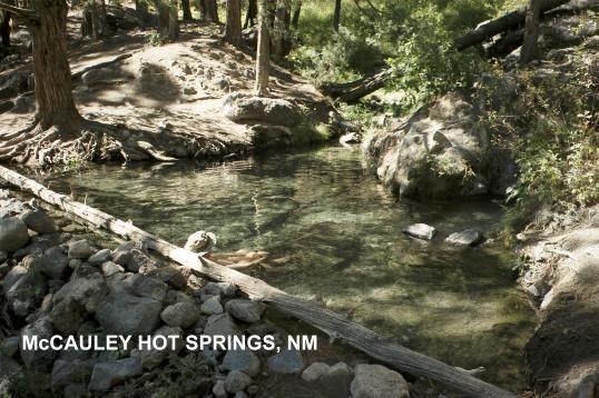 MC CAULEY WARM SPRINGS [MCCA]: Deep in the Santa Fe National Forest, McCauley is a beautiful warm springs, about 85 degrees, and a very nice hike on Trail #137 about 1.5 miles each way. There are several pools, some very large, with perfectly clear water, in a very scenic glade. PHOTO. LAT, LON :lat=35.8202, lon= -106.6274(source: Soak.net files) (accuracy:exact) LINK TO GOOGLE MAP. Verified (Jemez Falls route only), 9/02. Very confident. There are two ways to get here: