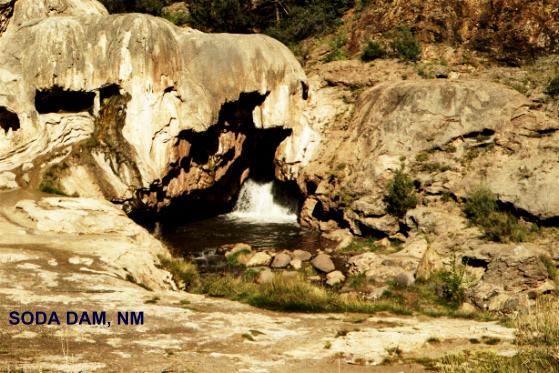 SODA DAM [SODA]: Soda Dam was formed in the Jemez River where minerals from a natural spring made a dam that blocks the J�mez River. Through a hole in the dam, the river forms a waterfall. The spot below the falls is a popular swimming hole. PHOTO. LAT, LON :lat=35.7931, lon= -106.6858(source: Soak.net files) (accuracy:exact) LINK TO GOOGLE MAP Verified, 9/02. Very confident. To get here: continue west (really south) on RT 4 toward Jemez Springs to a sign that says "Jemez State Monument 2 miles" then in another mile come to a large white formation that crosses RT 4 - this is the soda dam. There is a parking area just past the dam on the left. The waterfall and swimming hole are very visible from here. (The Bath House in J�mez Springs has natural hot mineral baths and massages. Fee charged. )