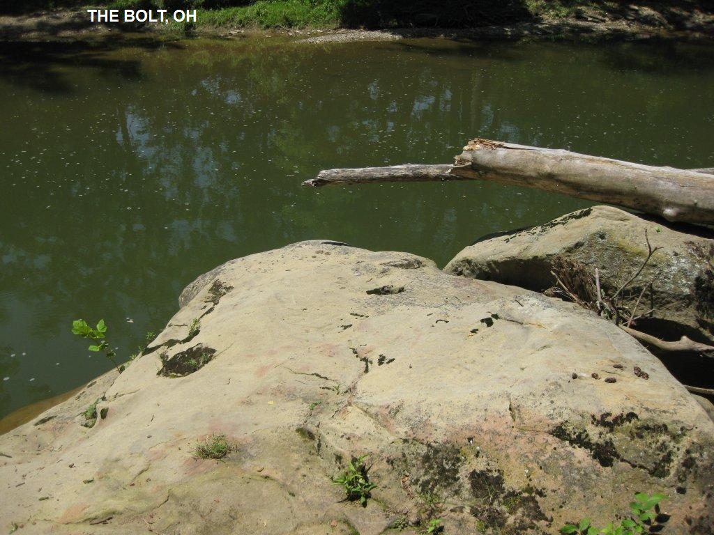 DIRECTIONS | From Woodsfield (which is about 10 miles south of I-70 about half way between Wheeling (WV) and Cambridge (OH)- it is also a short way southeast of Barnesville): In Woodsfield, get on RT 26 north. Drive about 4.5 miles, staying on RT 26 as it turns often. You'll go down a steep winding hill, cross a small bridge over Sunfish Creek, then start up another hill. Start watching for a small pull off on the right side of the road. There is a worn path to The Bolt there. Follow it down to the creek, and you'll come to a huge boulder. The swimming hole is here.