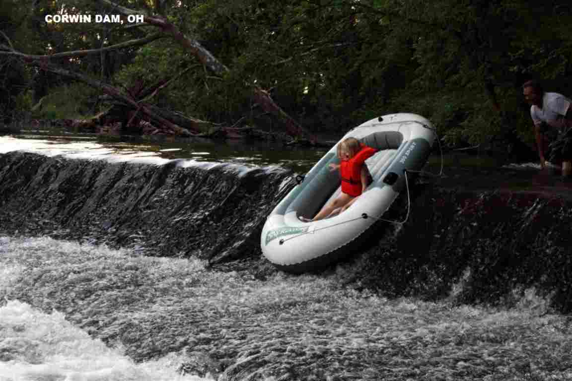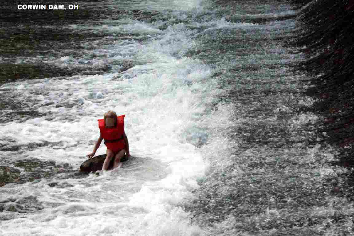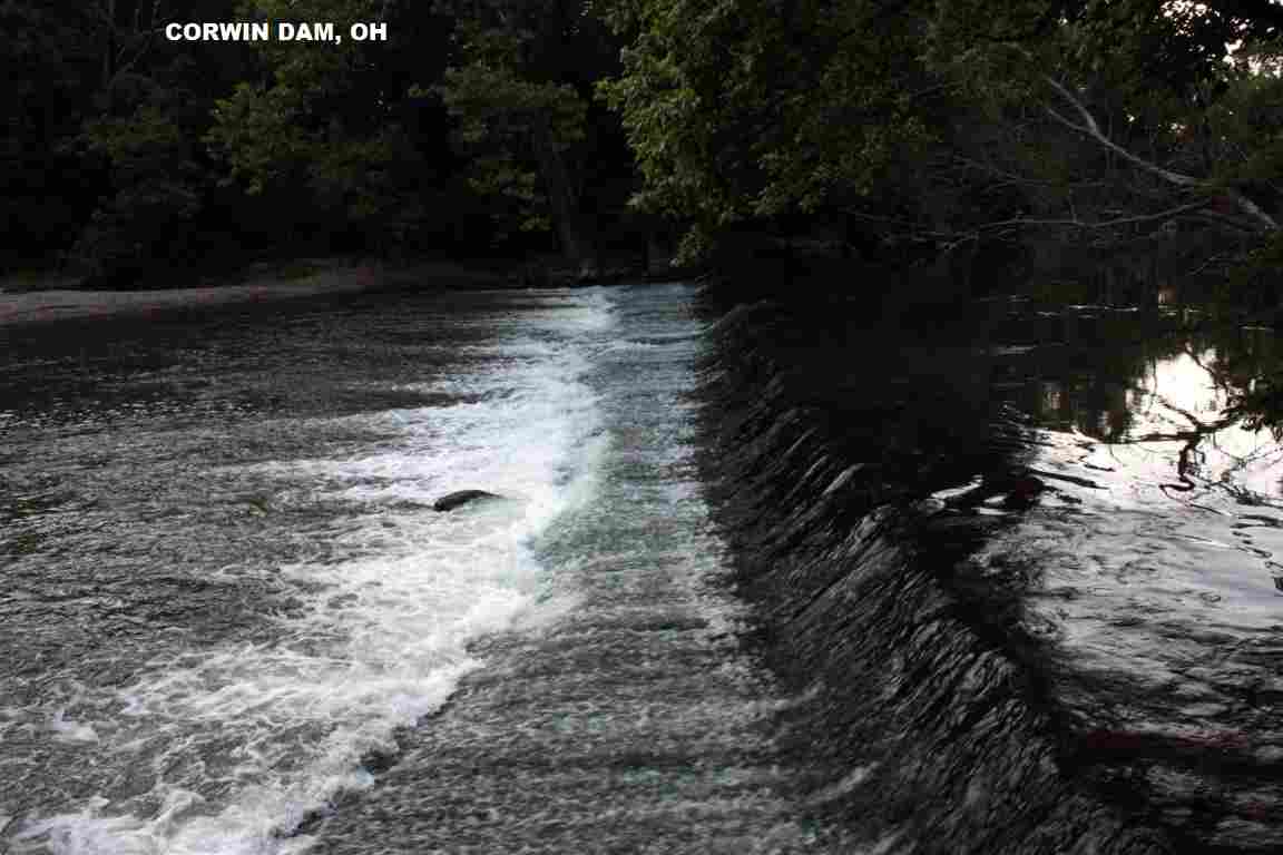 CORWIN DAM [CORW]: There is a small dam with a drop of about 4 feet in the Little Miami River just north of the town of Corwin.PHOTO , PHOTO , PHOTO , PHOTO. The water at the top of this dam is 3-4 inches deep, and the water at the base of the dam is 1-2 feet deep. The water flows quickly over the dam and then empties at a horizontal angle into the river below. This forms a perfect water slide with almost no back-tow to worry about. The depth of the water means that no swimming is required. However, if you're looking for a dip, start walking up river from the top of the dam. It drops off to at least 6 ft deep about 100 feet away from the dam.