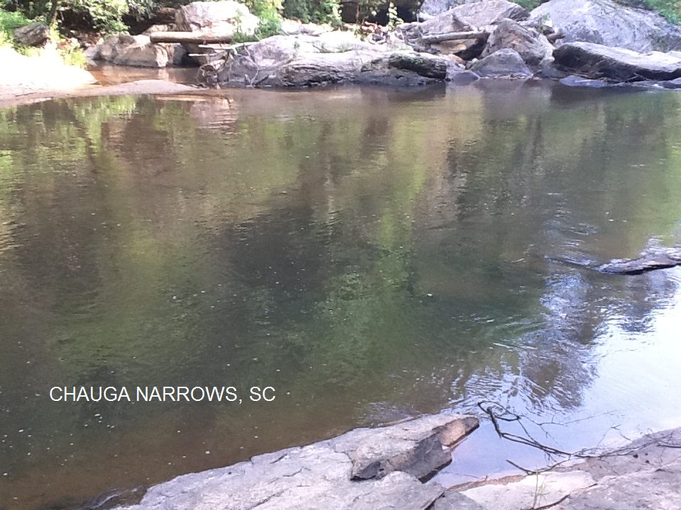 CHAUGA NARROWS [CHAN]: Really just a rapids on the Chauga River, but has a fantastic swimming area. Deep and large enough to swim laps. Also has sand and shallow entry. PHOTO , PHOTO , YOUTUBE VIDEO. Remote for bathing suit optional. To get here, from Walhalla, go west on RT 28 about 6.6 miles to (just past the Stumphouse Ranger Station) then turn left onto Whetstone Rd. (Oconee County S-37-193). Drive 3.8 miles (past turnoff for Blue Hole Falls, above)to Blackwell Bridge (this bridge crosses the Chauga River) and park beyond the bridge on left side of road. Hike 0.6 mile downstream to the falls on a faint path that parallels the river. Can drive part way with four-wheel drive vehicle.
