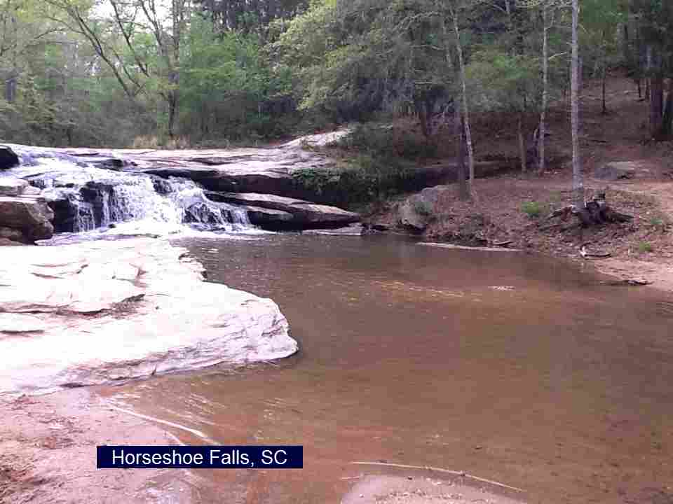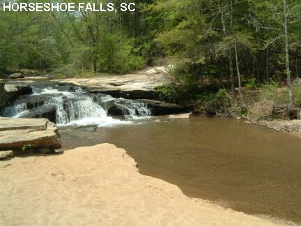 DESCRIPTION | This is a quote from Allen Easler's South Carolina Waterfalls site - photos & info : "Horseshoe Falls (aka Gordons Mill Falls) are on Cedar Shoals Creek just northeast of where the creek joins the Enoree River. The 10-foot high falls have always been a popular picnic area and swimming hole for locals (read: party spot)." The water may not be deep enough to really swim here most times. |