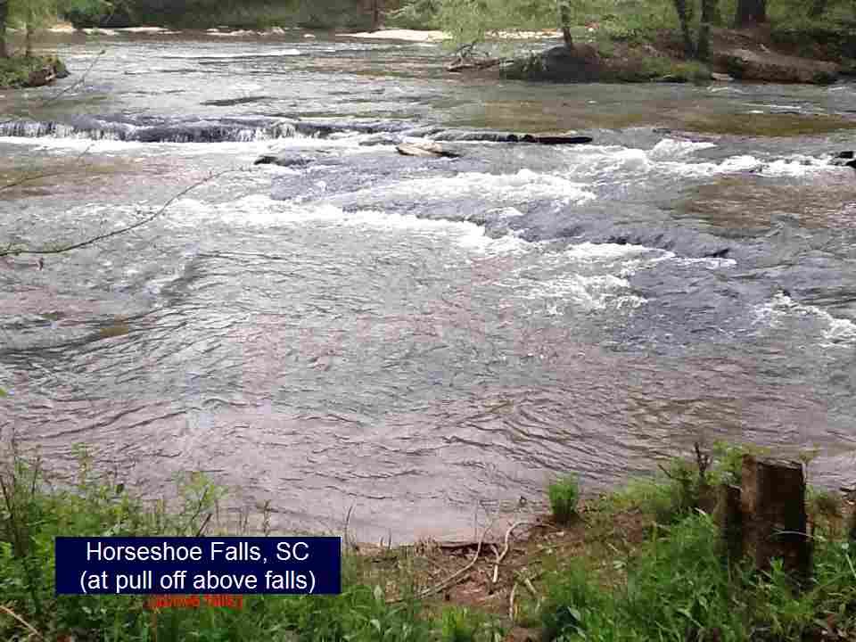DIRECTIONS | "From Exit 52 of I-26 (south of Spartanburg), take RT 56 north toward Cross Anchor. Cross the Enoree River and go approximately one mile up the hill. Take a left onto Horseshoe Falls Road. Horseshoe Falls will be on the left immediately after crossing Cedar Shoals Creek on an old iron truss bridge. Park at the vehicle barricades on the left beside the bridge or on the left at the top of the hill." There is swimming at the bottom of the falls and also another swimming hole (also pretty shallow) accessible from the parking area that is up the hill on the left (where the park information sign is). |