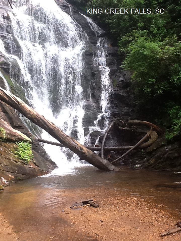 KING CREEK FALLS [KING]: Beautiful falls with water play/wading place at bottom. A short hike from Burrell Ford campground (above). PHOTO , PHOTO , YOUTUBE VIDEO Not deep enough to swim, but good for wading. To get here from the parking area for Burrell Ford campground (above) park in the area on the left at Burrells Ford Campground sign. Hike the Chattooga Trail/ road (gravel) that begins at the southern end of the parking lot. Follow it 0.3 mile, past the last campsite on the right side of the trail and just north of King Creek. Take the first left (east) by the north bank of the creek. Proceed 250 yards and cross over the creek on a bridge.