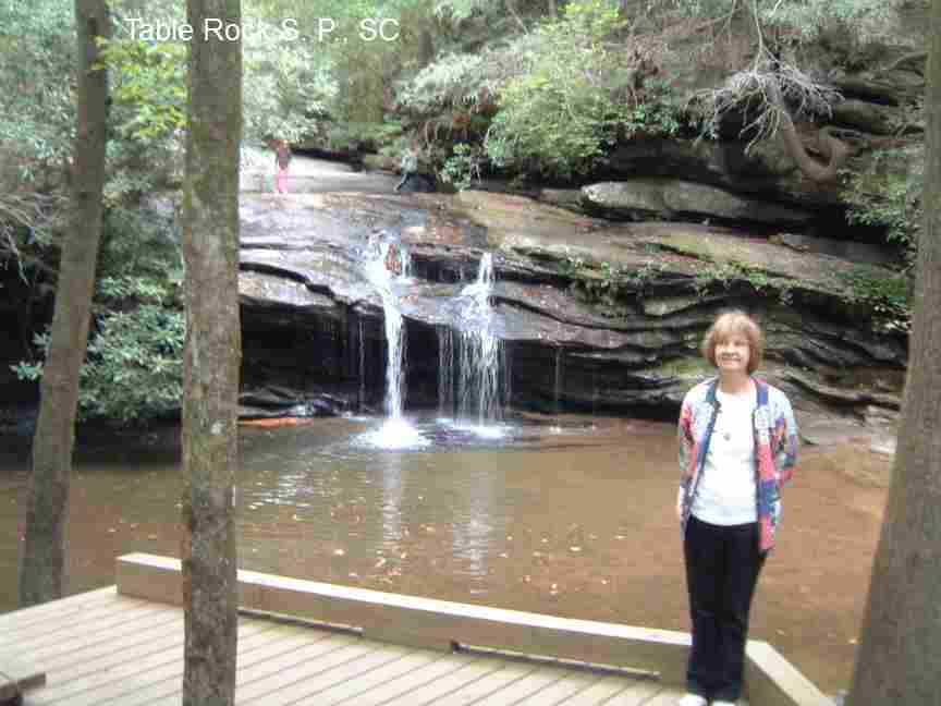 TABLE ROCK S. P. [TABL]: The park has many small waterfalls on Carrick Creek and Green Creek along the 1.9 mile Carrick Creek loop trail. Many of the falls are between 5 to 10 feet high with a small volume flow ( PHOTO ). One place very near the beginning of the trail has a pretty deep pool at the bottom ( PHOTO ). For more photos and more info, see this web site WEB SITE To get here: stay on RT 11 past where RT 276 goes north then follow signs to the State Park. Enter the park and follow the signs to the nature center. Park in the lot across from the nature center and cross the road. Fill out the hiker registration form. The Carrick Creek, Table Rock and Pinnacle Mountain trails all begin behind the nature center. Very confident. Verified 9/2011. Updated 9/2011. LAT, LON lat=35.0315, lon=-82.700(source: DeLorme) (accuracy: approximate) LINK TO GOOGLE MAP.