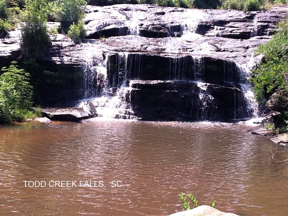 DIRECTIONS | From Six Mile (north of Clemson), take SC 133 south for .5 mile to Maw Bridge Road. Turn left and drive 2.8 miles to Welcome Baptist Church. Take the next road to your right (Brookbend Road) and follow for .4 mile to the bottom of the hill where there is a bridge over Todd Creek. Look for the three sets of high voltage power lines overhead to be sure you are at the right spot. Find a place to park along the side of the road by the bridge. On the far side of the bridge, under the power lines, look for a trail/road on your left. Walk this trail about 5 minutes then keep left where it goes down to the creek. Wade across the creek then continue downstream another .1 mile and take a steep path down to the falls.