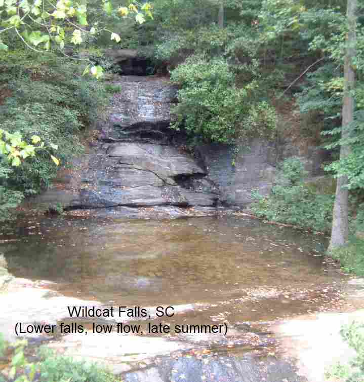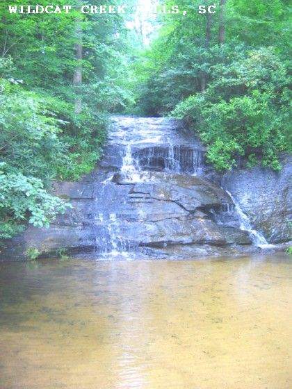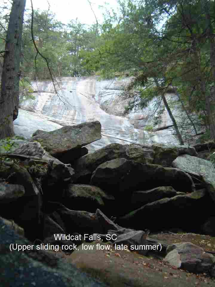 WILDCAT FALLS [WILD]: At the Wildcat Wayside State Park, the popular Wildcat Falls has only a shallow pool at the bottom ( PHOTO , PHOTO ) but if you go up the trail a bit (about .25 mile) above the falls there is a more swimmable pool plus a 130 foot waterslide on a sliding rock. ( PHOTO ) (May be very little water here after a dry summer.) This from a visitor: "Sometimes when I stop it's full of families using it just to take a half hour off from a long drive to cool off. Above the falls, on Wildcat Creek, is a sliding rock and swimming hole that apparently is quite popular with the college kids from upstate SC." LINK TO INFO AND PHOTOS. The lower falls are good for the whole family, the upper sliding rock and pool present some dangers (the slide is very high and you have to climb over huge boulders to get to it) and may not be suitable for children. To get here: Stay on RT 276/11 west for about 5 miles past where RT 11 joins RT 276 and look for a pull off (unsigned) on the right (north) side of the road, which is the Wildcat Wayside State Park. Wildcat Falls is right by the side of the road. To get to the sliding rock up the trail, go up the wooden stairway from the parking area and go right at the top and follow the trail across a bridge for about .25 miles. At the end of the trail, climb over large boulders to reach the bottom of the huge sliding rock. Pretty confident. Verified 9/2011. Updated 9/2011. LAT, LON lat=35.07394, lon=-82.59697(source: DeLorme) (accuracy: approximate) LINK TO GOOGLE MAP.