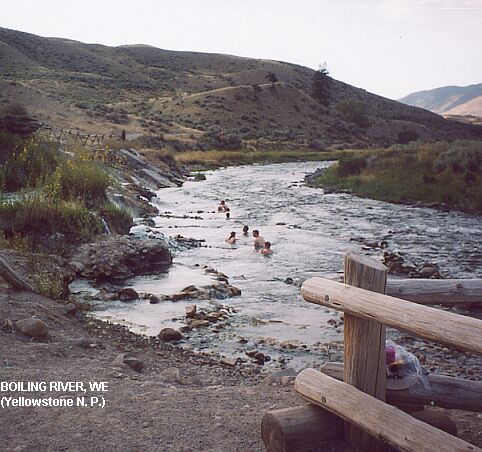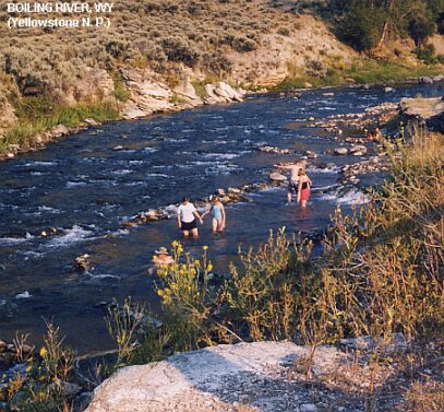 BOILING RIVER [BOIL]: A short walk (.5 miles each way) along the Gardner River to a wonderfully fun place where a stream of 140 degree water called Boiling River comes mysteriously out of the ground (thought to be the outflow of Mammoth Hot Springs) and pours over ledges into the very cold Gardiner River. Numerous visitors take the short walk to a section of the Gardner River where thermally heated streams feed into the Gardner River. The combination of the boiling water with the cold river create a warm swimming hole. The area is closed early in the season when the Gardner River is above a safe level for swimming. BE CAREFUL- DO NOT WALK OR OTHERWISE GET INTO THE BOILING RIVER STREAM- IT IS SCALDING HOT! PHOTO 1 , PHOTO 2.