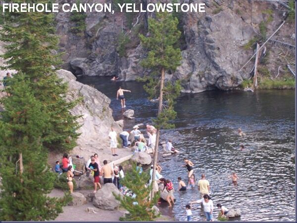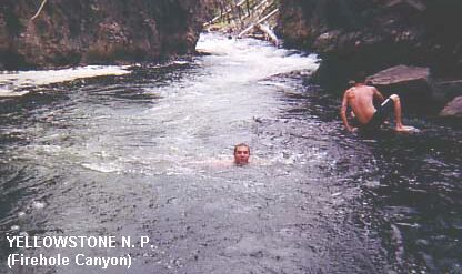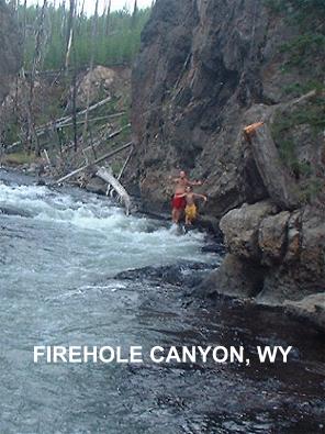 FIREHOLE [FIRE]: Firehole River Canyon in Yellowstone N.P. is a great place to spend a few hours and get a respite from the desert sun. It includes rapids emptying into a deep pool as well as shallow sections outside the current (all should be careful to keep out of the main current - A GIRL DIED HERE IN 2003 JUMPING INTO THE CURRRENT AND GETTING TRAPPED UNDER AN OVERHANGING ROCK - DON'T DO IT.) PHOTO 1 , PHOTO 2 , PHOTO 3. The water is warm for this elevation because the river contains the runoff from many thermal features, including Old Faithful. Portable toilets are available (as of summer 2001). Camp at Madison campground near Madison Junction near the West Yellowstone entrance in order to be near the swimming.