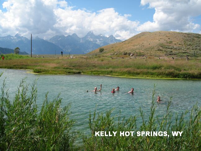 KELLY WARM SPRINGS [KELL]: OK, these are not the greatest hot springs in the west (the temp is only "warm" and it has a marshy shoreline) BUT the view is fantastic (the Grand Tetons in all their glory - SEE PHOTO ), they are big enough to actually swim in, easy to access and shallow enough for the kids. It is south of Yellowstone and east of the Grand Tetons in the Jackson Hole area of Wyoming. LAT, LON lat=43.63950, lon=-110.61631(source: DeLorme) (accuracy: exact) LINK TO GOOGLE MAP. Very confident. Verified.